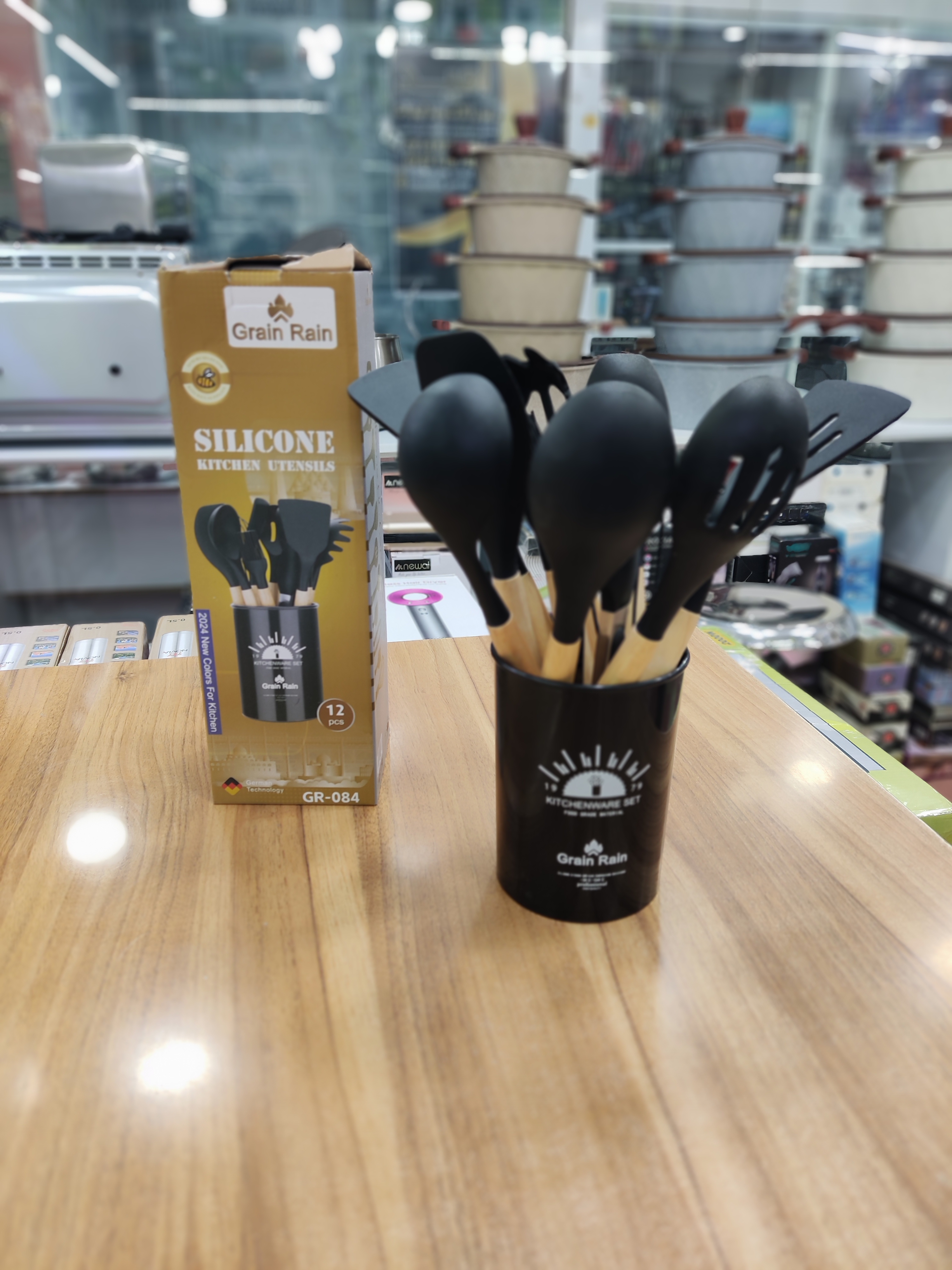 ست کف گیر و ملاقه 12پارچه گراین راین Grain Rain ساخته شده از با کیفیت ترین مواد سیلیکونی با استاندارد FDAو بدون BPM؛ دسته های چوبی از جنس بامبو و یک ظرف نگهدارنده از جنس پلاستیک میباشد