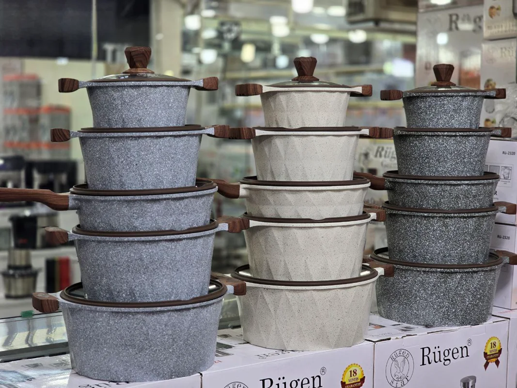سرویس قابلمه روگن شامل چند قابلمه با اندازههای مختلف و یک ماهی تابه است که جنس قابلمه از نانو گرانیت بوده که کاملا ضدخش و نسوز میباشد همچنین، دارای درب پیرکسی است که میتواند دمای غذا را نگه داری کند و به راحتی دیده شود.